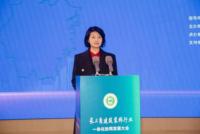 浙江省建筑装饰行业协会贾华琴会长出席会议并讲话。她指出,本次会议的召开是长三角建筑装饰协同发展的举措之一。希望长三角装饰行业企业将围绕以下几方面进行提升服务:一是要以长三角装饰行业协同为目标;二是要以建筑装饰产业提升为核心;三是要以绿色装饰为引领;四是要以智慧化装饰建设为手段;五是要以打造“长三角建筑装饰一体化合作平台”为抓手。希望长三角装饰全体从业人员以“和美装饰 美好生活”为行业愿景,共同推动长三角装饰行业一体化协同,为装饰行业现代化高质量发展而努力。