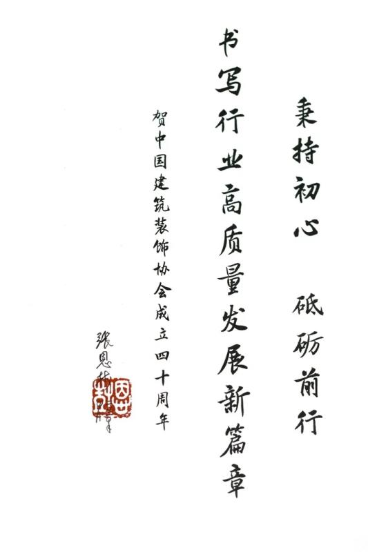 张恩树:我知道,由于种种原因,建筑装饰行业在经历了30多年的高速发展之后,现在遇到了不少的困难。但我仍然看好这个行业的未来。我们这个行业的任务就是通过富有创意的设计和精湛的施工,创造出更加安全、舒适、便捷的生活环境和生活方式,满足人民群众对美好生活的向往。这是一个肩负光荣的使命,任重道远的行业;这也是一个具有坚实的市场需求,可持续发展的行业。我相信,建筑装饰行业一定能够战胜困难,实现转型升级,走上高质量发展的道路。