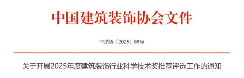 为全面贯彻党的二十大精神和二十届二中、三中全会精神,深入落实习近平总书记关于科技创新重要论述和中央人才工作会议精神,根据中共中央办公厅 国务院办公厅印发《关于完善科技激励机制的意见》的要求,同时按照中央经济工作会提出的科技创新引领新质生产力发展,建设现代化产业体系的要求,推动我国建筑及装饰行业科技创新和产业创新融合发展,激发企业创新活力,增强企业及科技人员创新动力和信心,经协会研究决定开展2025年度建筑装饰行业科学技术奖推荐评选工作,现将有关事项通知如下:
