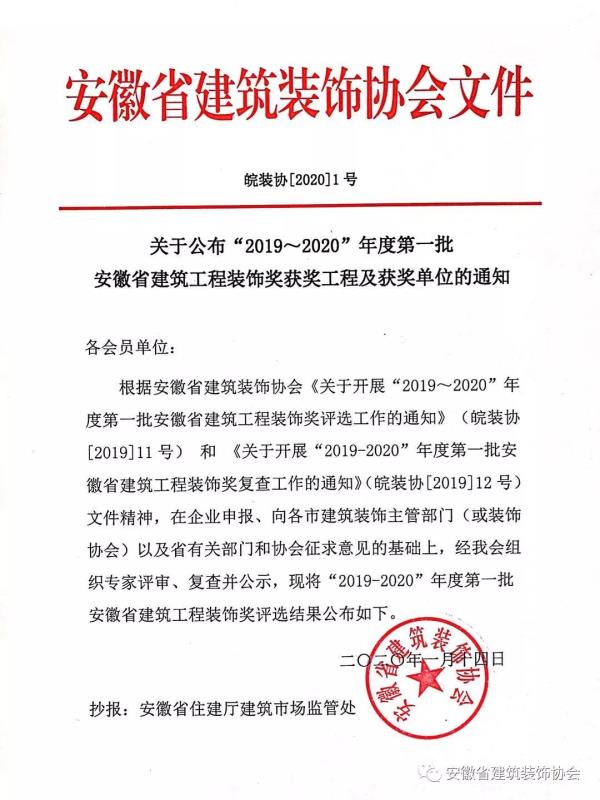 “2019~2020”年度第一批安徽省建筑工程装饰奖 获奖工程及获奖单位名单