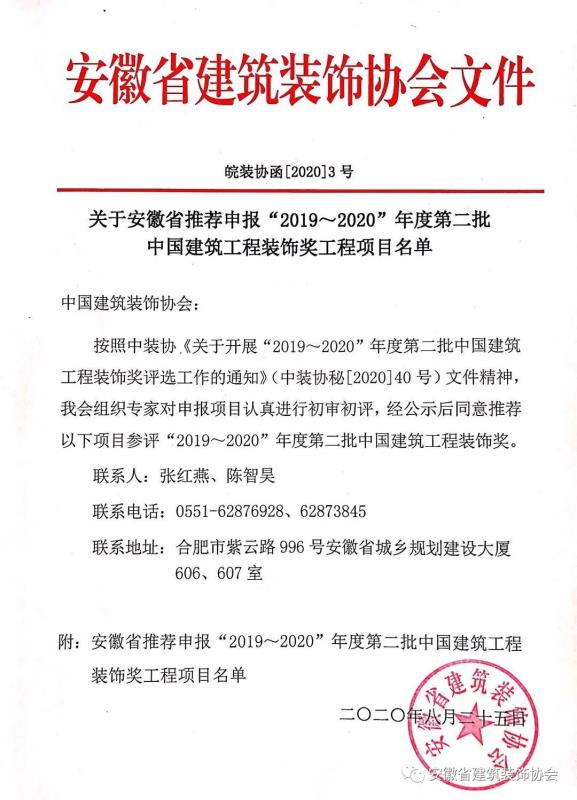 安徽省推荐申报“2019~2020”年度第二批中国建筑工程装饰奖工程项目名单