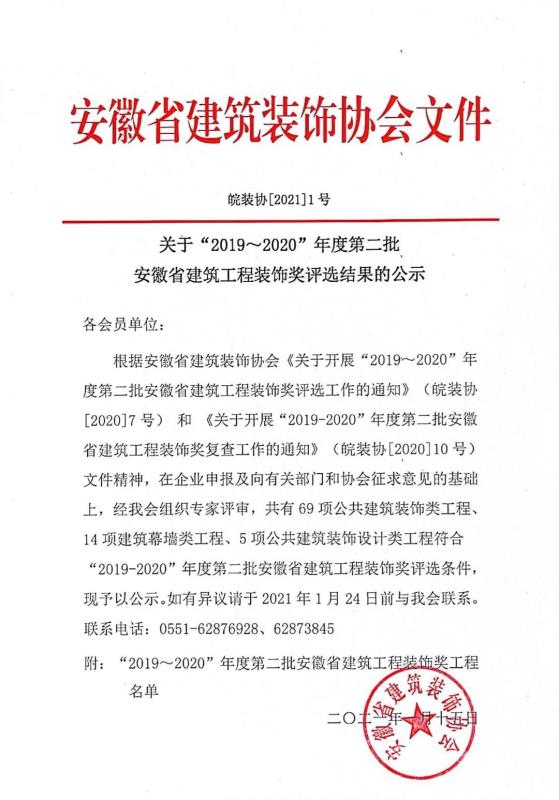 “2019~2020”年度第二批安徽省建筑工程装饰奖工程名单