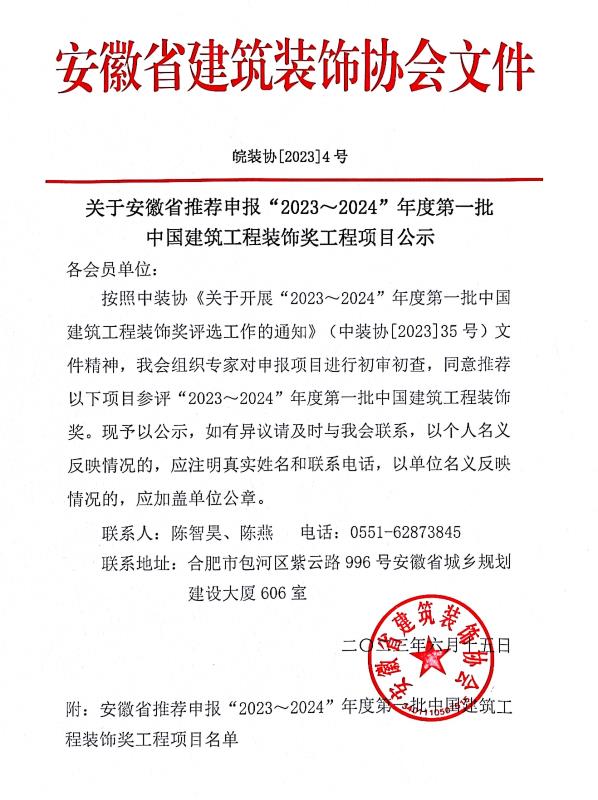 附: 安徽省推荐申报“2023~2024”年度第一批中国建筑工程装饰奖工程项目名单