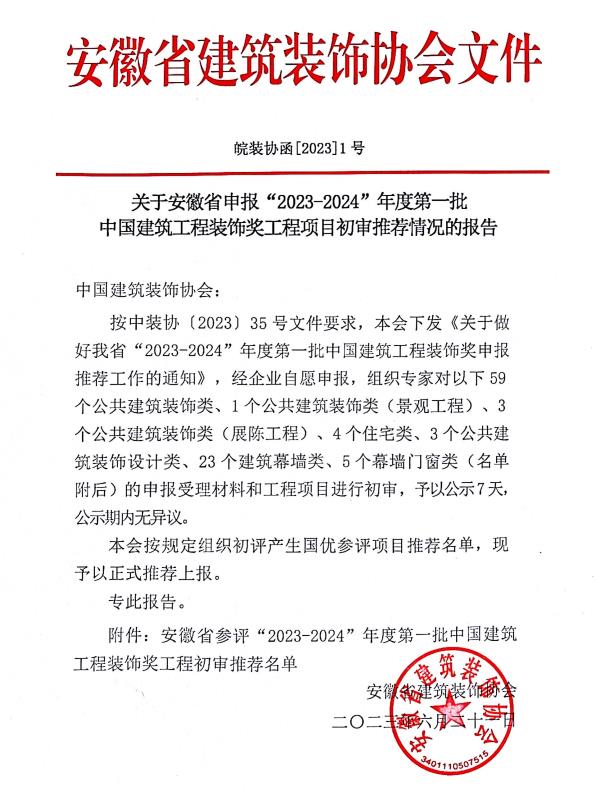 安徽省参评“2023-2024”年度第一批中国建筑工程装饰奖工程初审推荐名单